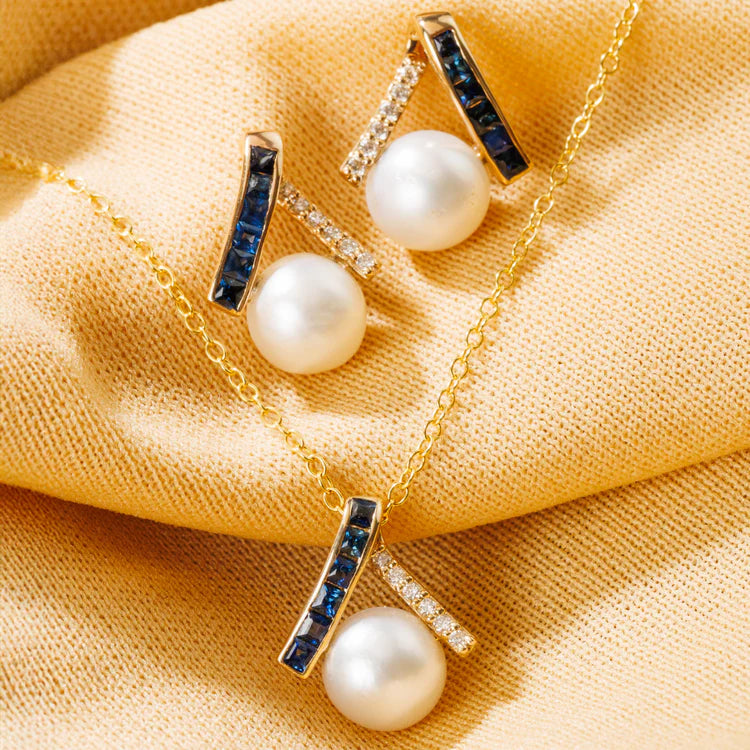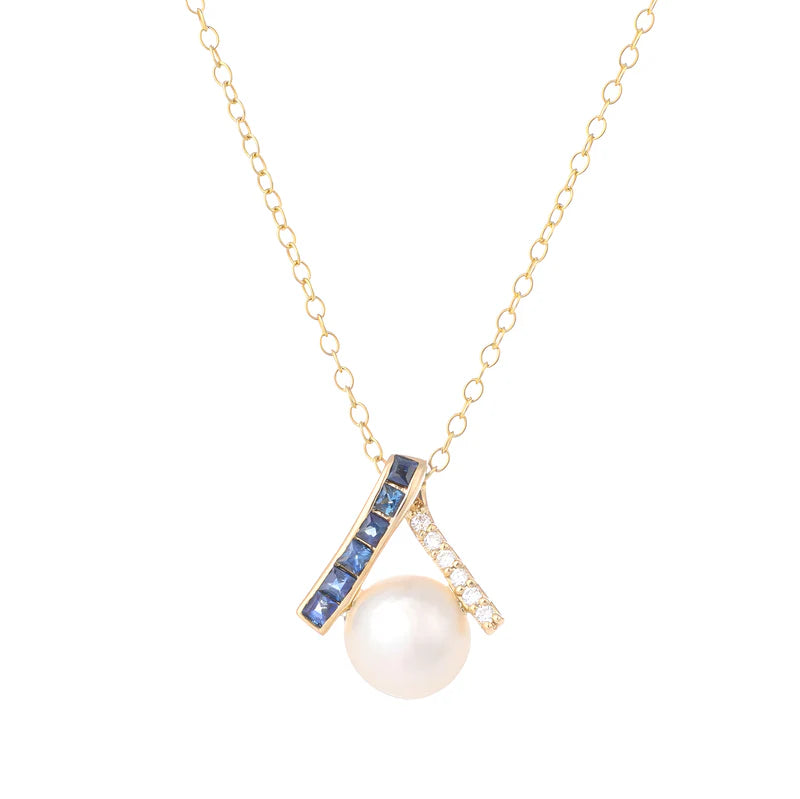 Auri gems necklet 9ct yellow gold fine chain 9mm South Sea pearl 6 x round brilliant cut diamonds & 6 x blue princess cut sapphires channel set